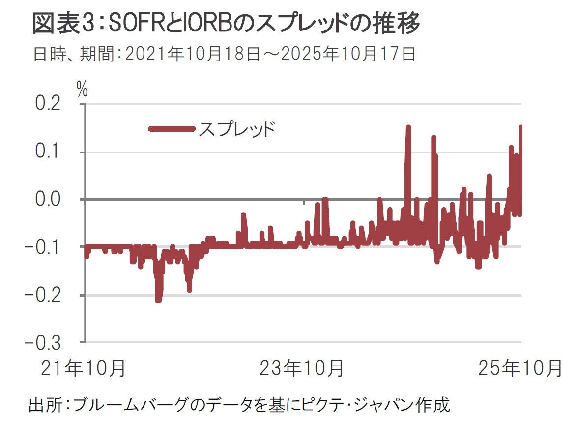 短期金融市場のストレスを示唆する指標はいくつかあるが、代表的な指標である担保付翌日物調達金利(SOFR)と準備預金金利(IORB)の金利差(スプレッド)が足元プラスに転じている(図表3参照)。スプレッドのプラスは流動性不足、マイナスは過剰流動性を反映するとみられている。19年の短期金融市場の混乱前もスプレッドは概ねプラスで推移していたことから、他の指標も参照する必要はあり、何が決め手かは断定できないとしても、注意が必要な段階に入ったのではないだろうか。