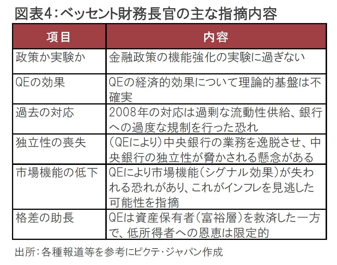 しかし、量的金融緩和政策対する批判が政治サイドから根強い点に注意したい。代表的なのはベッセント財務長官が9月に米大手新聞に寄せたコラム記事や、インターナショナル・エコノミー誌とのインタビューと寄稿文で量的金融緩和政策への批判を展開した(図表4参照)。主な指摘を順不同で図表4に示した。筆者は量的金融緩和(QE)をこれまで「政策」と呼んできたが、「実験」と呼ぶのは何もベッセント長官だけではない。QEの効果は理論的説明が不十分なままに効果があるのかを手探りで進めている面もあるとの指摘は多く聞かれる。リーマンショック後、QEを推し進めたFRBのバーナンキ議長(当時)は退任前に、「QEの問題は、実際には効果があるのに、理論的な説明ができないこと」といった趣旨の発言をしている。FRBは少なくとも、QEの有効性(効果)を示し続けるとともに、19年の二の舞は回避する必要があるだろう。
