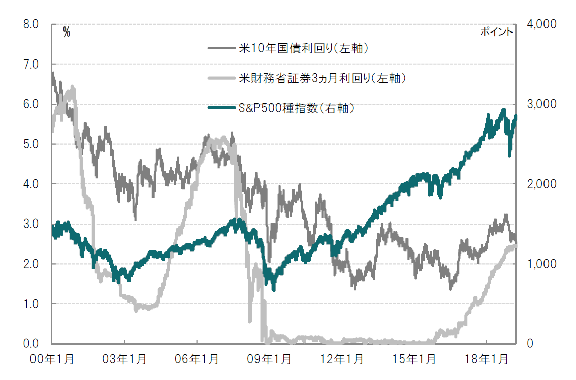 S&P500種株価指数(右軸、ポイント)、期間:2000年1月2日~2019年3月25日