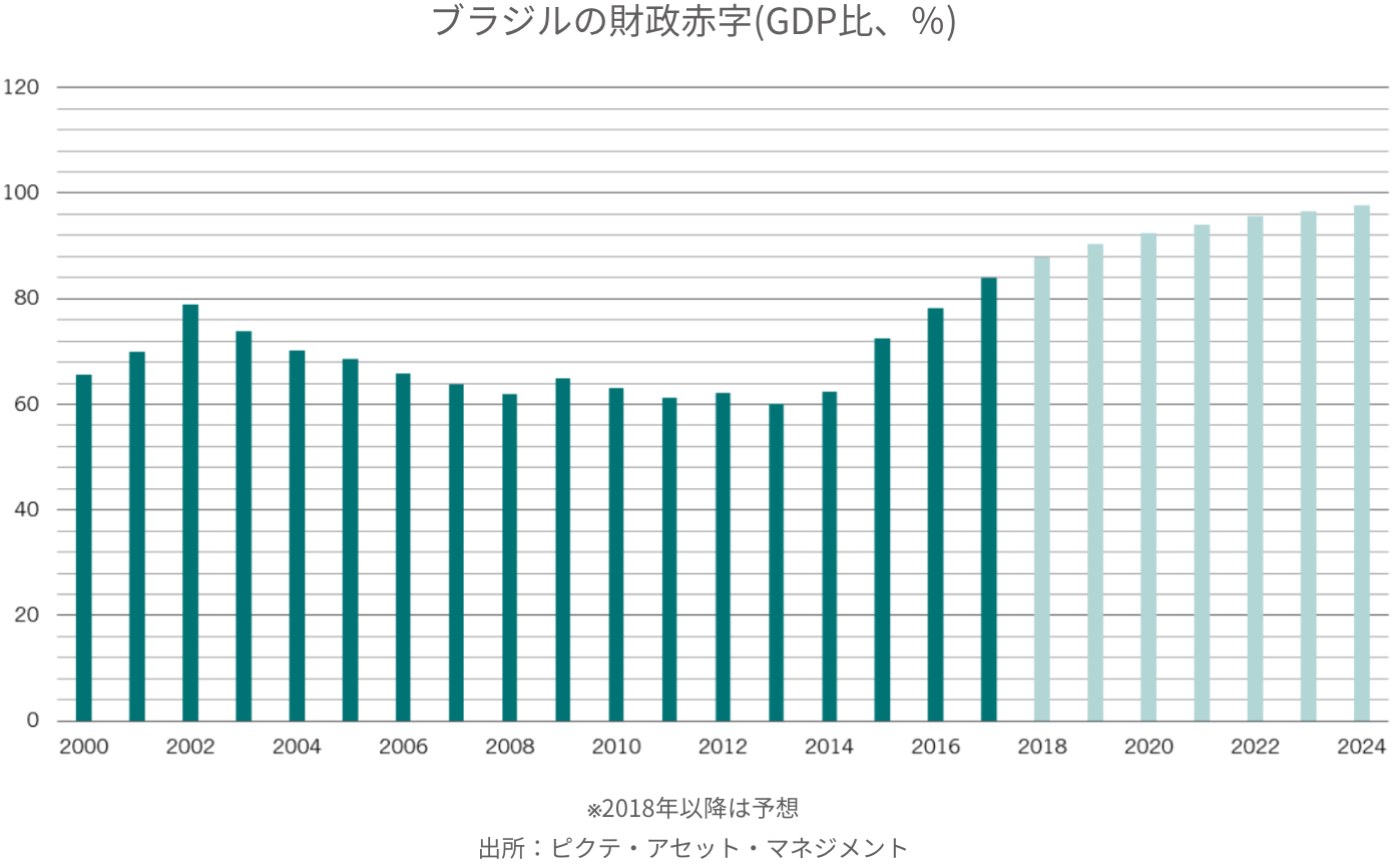 多数の政党が乱立する下院構成や議会と政権との緊張関係が、政権の命運を左右する年金改革法案の審議を遅らせているからです。年金関連支出の1.2兆レアル(約3,020億ドル)の削減を目指す大統領の野心的な試みは、旧来型の政治を押し切る過程で5,000億レアル程度に下方修正される可能性が高く、大きな問題となりそうです。ピクテの試算では、景気の浮揚と投資家の信頼の回復には、財政赤字をGDP比で2.5%削減する必要がありますが、半分は年金改革を通じて、また残りの半分は国有資産の民営化や法定最低賃金の(前年の全国消費者物価指数および前々年のGDP成長率に基づいた)指数化の撤廃を通じて実行されると考えます。個人的な予測では、最も楽観的な景気回復シナリオの実現には、年金関連支出を少なくとも8,000億レアル(約2,010億ドル)削減する必要があると考えます。