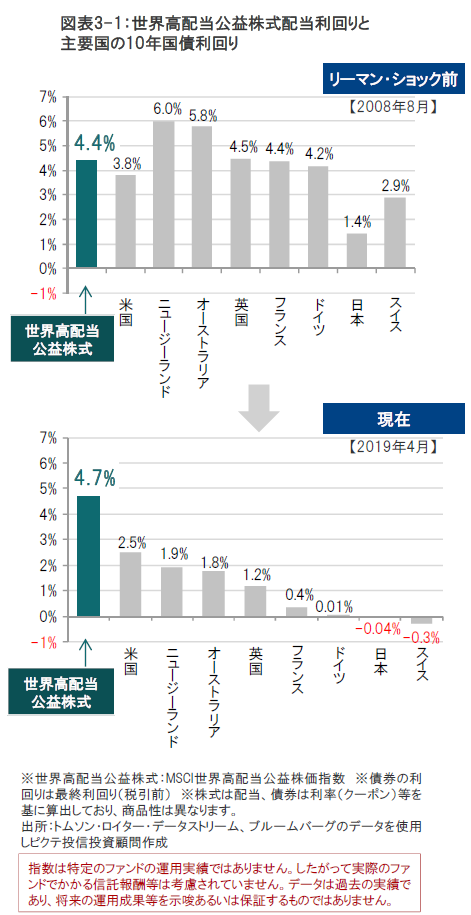 世界高配当公益株と主要資産の利回りをリーマン・ショック前(図表3-1上)とその約10年後の直近、2019年4月末時点(図表3-1下)とで比較すると、オーストラリア10年国債の利回りは5.8%から1.8%へと半分以下に、日本10年国債の利回りは1.4%からほぼ0%へ、スイス国債にいたっては2.9%から-0.3%へとマイナス圏となり大幅に低下しています。