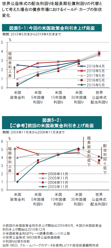 前回の米国政策金利引き上げ局面では、利回り曲線(イールド・カーブ)がフラット化(短期金利が上昇する一方で、超長期金利が低下)し、金利差が縮小する現象が見られました。その際には、世界公益株式の配当利回りの魅力が高まり、株価が上昇し、配当利回りは低下しました(図表5-2参照) 。
