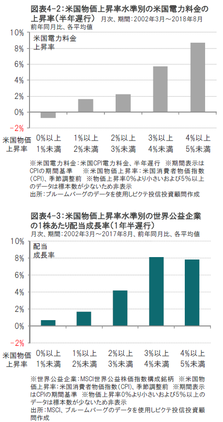 図表4-3は米国の物価上昇率の水準別に、世界の公益企業の配当成長を今度は1年半ずらして分析したものですが、物価上昇率が高いほど、世界の公益企業の配当成長率も高くなっていた事が示されています(図表4-3参照) 。