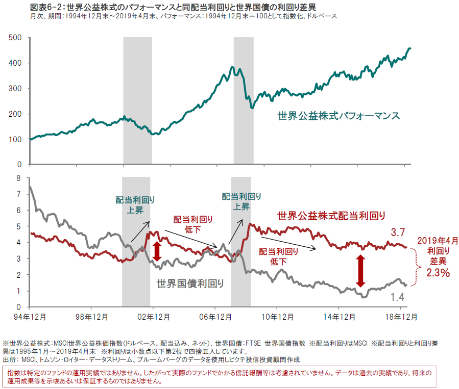 図表6-2上段は世界公益株式の配当込みのトータルリターンです。下段の図の赤色の折れ線は世界公益株式の配当利回りを示しています。灰色は世界国債の利回りを示しています。