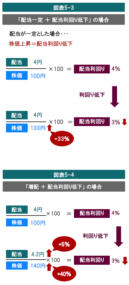 ご覧の様に株価が33%上昇すると、配当が一定ならば、配当利回りは4%から3%まで低下することになります。(図表5-3参照)