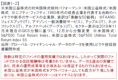 9年余り続いたFAANGがけん引した成長株の時代はかつてのニフティ・フィフティ相場、IT相場などの成長株の時代と類似点があります。いずれも10年ぐらいの期間でブームが一服すると次の10年は公益株に代表される資産株の時代が到来しています(図表1-2参照)。