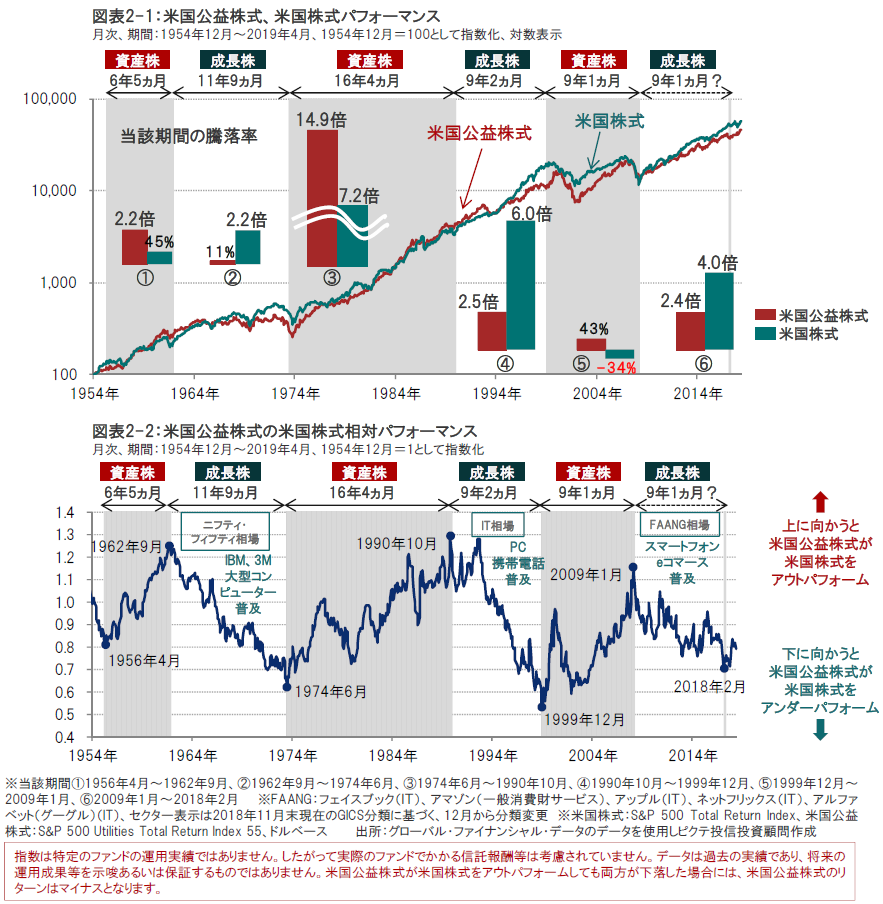 過去60年余りの実績でみると、米国株式と米国公益株式のパフォーマンスは、10年前後をおいて、米国株式のパフォーマンスが米国公益株式を上回った時期と、逆に米国公益株式のパフォーマンスが米国株式を上回った時期を繰り返しています。たとえば、1956年4月から1962年9月までは米国公益株式は2.2倍、米国株式全体では45%上昇しました。一方、1962年9月から1974年6月までは米国株式は2.2倍、米国公益株式は11%の上昇にとどまりました。(図表2-1参照)