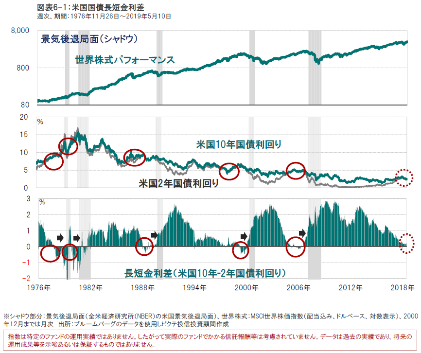 図表6-1の中段は、米国10年国債利回りと2年国債利回りの推移です。そして、下段では、10年国債の利回りから2年国債利回りを差し引いた、長短金利差を示しています。下段の長短金利差は縮小傾向にあり、イールドカーブはフラット化の方向に向かっています。さらに、中段の赤の丸、つまり長短金利差がマイナスとなり、イールドカーブがフラット化した後、約1年半後あたりで、景気後退局面がやってきて、世界の株式も大きく下落していることがわかります。 (図表6-1参照)