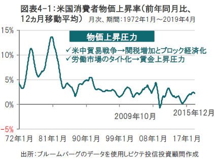 ただ、足元は物価上昇傾向にあり(図表4-1参照)、すでにデフレ懸念を脱却し、さらに今後の見通しを考えますと、米中貿易戦争による関税率引き上げに代表されるブロック経済化や、歴史的な低水準の失業率に示されているように労働市場がひっ迫しており、すでに時間当たり賃金が上昇し始めているなど、今後もインフレ圧力がかかってくることが想定されます。