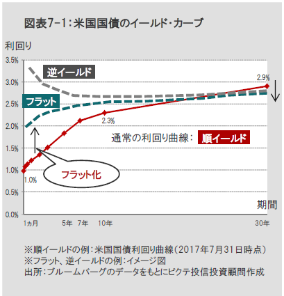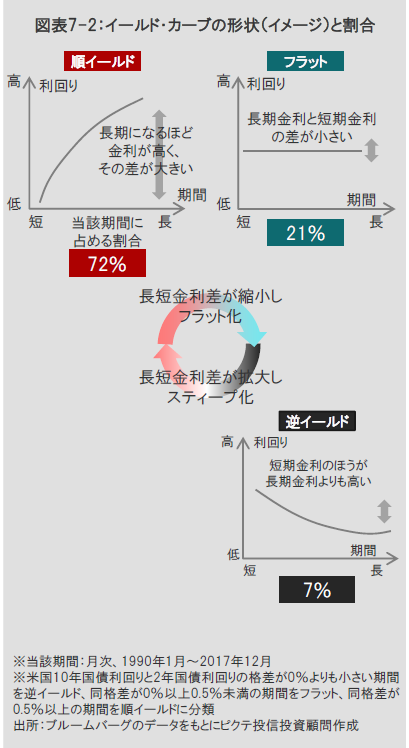 過去の実績では、イールド・カーブは順イールドから長短金利差の縮小でフラット化し、その後逆イールドにシフトしたあと、再び順イールドに転換するサイクルが見られました。(図表7-2参照)