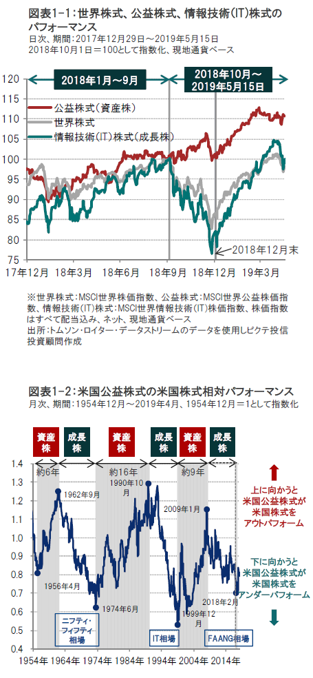 世界の株式市場は2018年10月以降、2018年年末にかけて、情報技術(IT)などをはじめとした成長株中心に大幅下落しました。一方、公益をはじめとした資産株は相対的に底堅く推移し、以降直近にかけても相対的に堅調に推移しています。