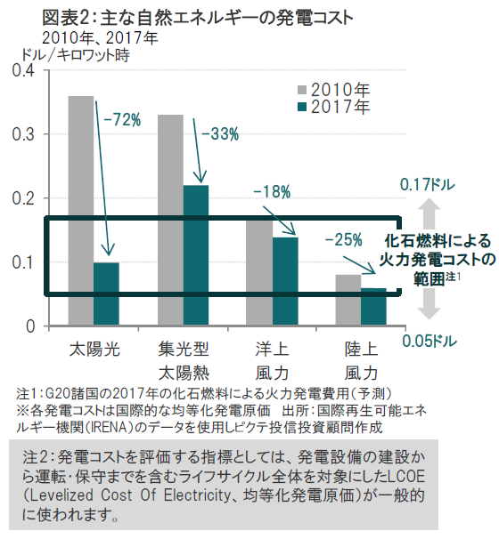蓄電池やスマートグリッド、発電設備などの技術革新により、平均的な発電コスト(LCOE注2)は2010年~2017年にかけて、太陽光で-72%、陸上風力で-25%低下しています(図表2参照)。