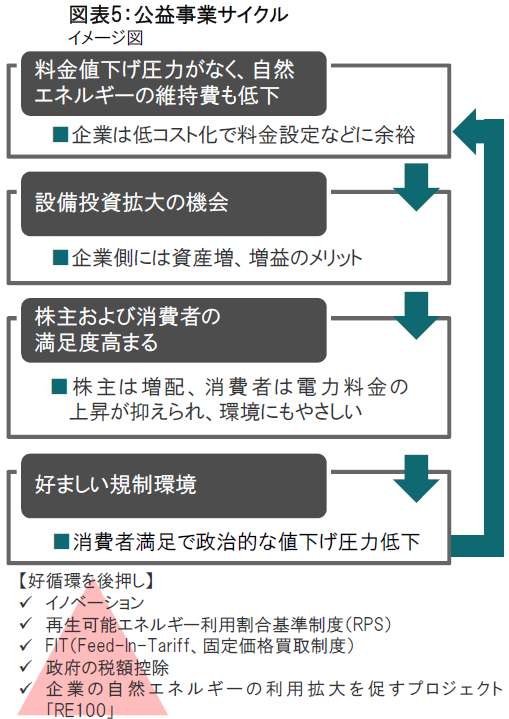 自然エネルギーへのシフトと設備投資拡大は制度上、規制下の公益企業の増益要因になる一方、運用コストの低下で電力料金を大きく引き上げる必要がないため消費者にとっても好ましく、様々な面からメリットがあり、好循環のサイクルが期待されます。