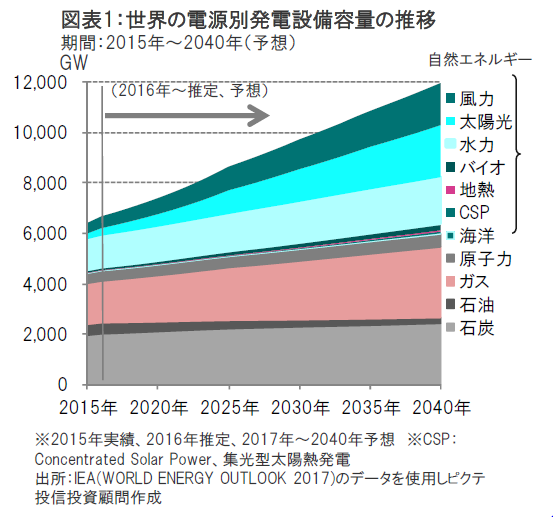 国際エネルギー機関(IEA)は世界の自然エネルギーの全発電容量に対する割合が2015年の31%から2040年には50%に拡大すると予想しています(図表1参照)。