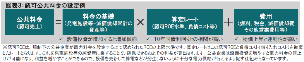 規制下の電力料金をはじめとした公共料金の計算方法は複雑で国や地域によって異なりますが、単純化すると、料金は発電施設の資産価値(レートベース)に対して一定の利益を確保する算定レート(ROEなどが元になる)を掛けて、燃料費などのコストをプラスして設定されます(図表3参照)。