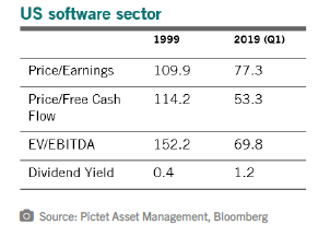 米国のソフトウェア・セクターのバリュエーション水準を、ITバブル期の水準と比べてみると、現在は依然として魅力的な水準にあると考えられます。株価/フリー・キャッシュ・フロー比率をとってみると、現在はITバブル期の約半分、配当利回りは3倍も高い水準です。