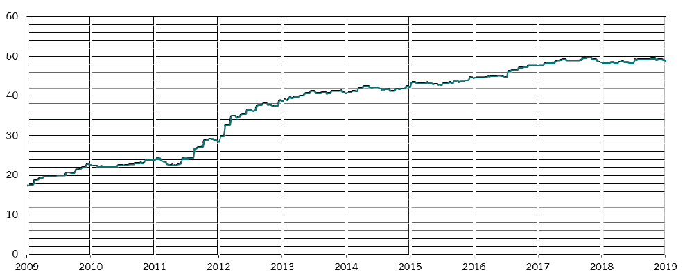 図表1: BBB格のユーロ債券市場(債券市場全体に対する比率、%)