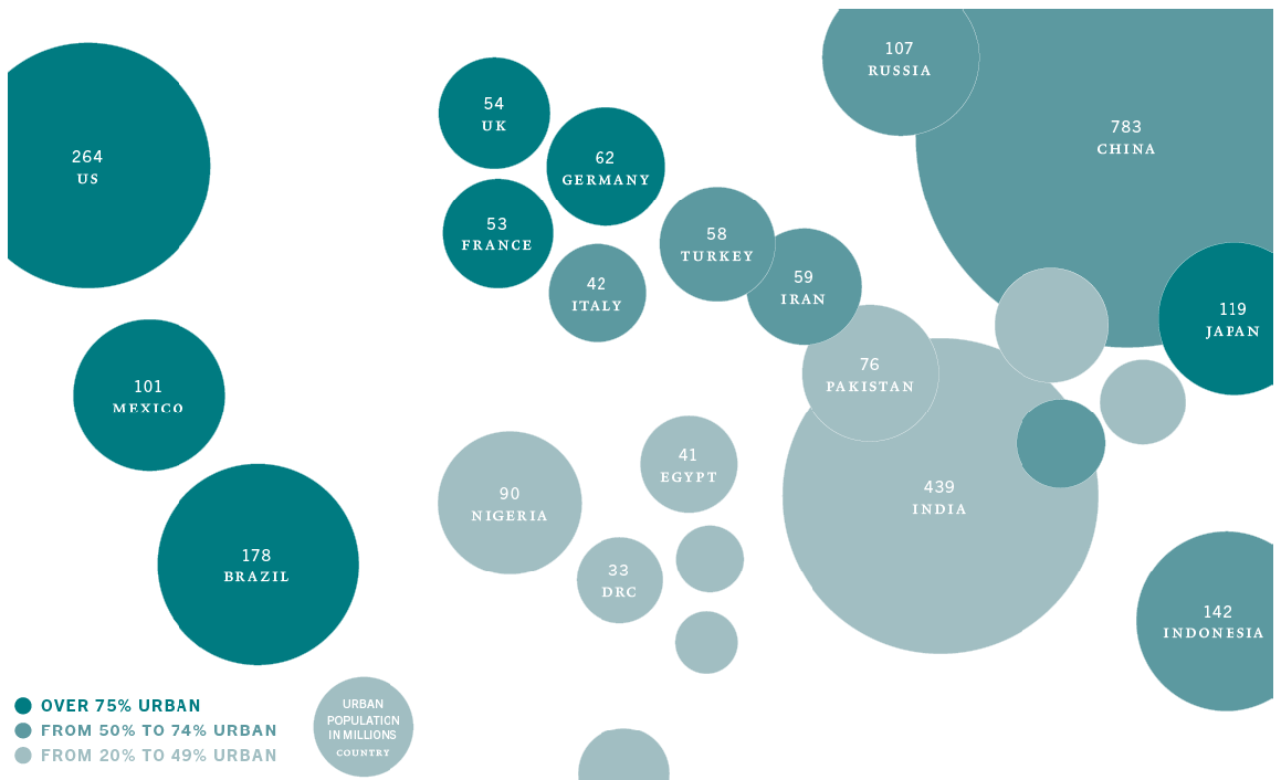 百万人、濃い緑色:人口の75%以上が都市に在住、緑色:人口の50%~74%が都市に在住、灰色:人口の20%~49%が都市に在住