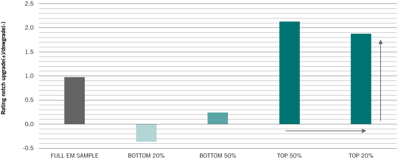 国連の「人間開発指数(HDI)」は、2001年から2017年にかけて、指数を構成する大半の新興国に状況の改善が見られたことを示していますが、上位50%の構成国の信用格付けが平均2.1ノッチ(2.1段階)引き上げられたのに対し、下位50%の構成国は僅か0.24ノッチの引き上げに留まっています。