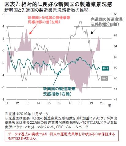 加えて、新興国と先進国の製造業景況感調査の動向を 比較すると、新興国が相対的に良好な状況となるなど、格 差が既に現れています。しかも、足元の格差は2013年以来 の大きな差となっています(図表7参照)。