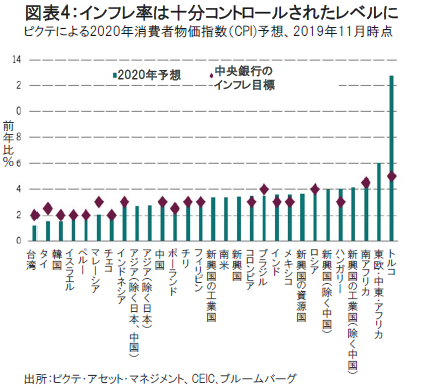 2020年の新興国経済にとってのもう1つの追い風は、イ ンフレ見通しです。アルゼンチンやトルコを除いた各国では、 インフレ率は低水準に抑えられると見込まれています(図表 4参照)。インフレ率が低水準に留まっていれば、追加的な 金融政策などによる景気下支えも機動的に行うことが可能 です。