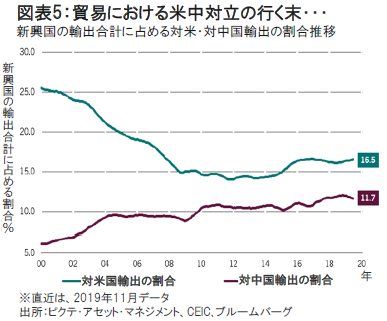 新興国の輸出に占める世界第1位と第2位の経済大国で ある米国と中国の割合の推移をみたものが図表5になります。 米中通商問題が依然として残る中で、新興国の対米輸出と 対中輸出の差は縮小、あるいは逆転することがあるのでしょ うか?ピクテでは新興国の対米輸出と対中輸出の割合の差 は縮小し、中国は新興国各国にとって輸出先としての存在 感を増していくものとみています。