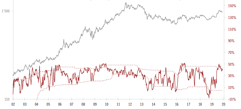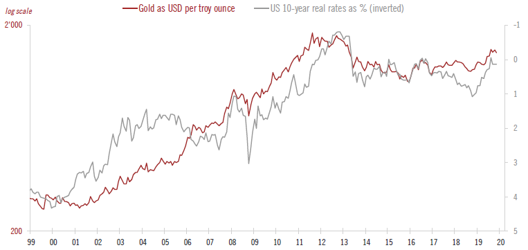 金は、ピクテの基本シナリオが前提とする米ドルの緩やかな減価の恩恵も享受すると思われます。従って、2020年は、投資ポートフォリオにヘッジとして金を組み入れることの根拠が損なわれず、金の相対的な保有コストは再び低下する公算が大きいと考えます。