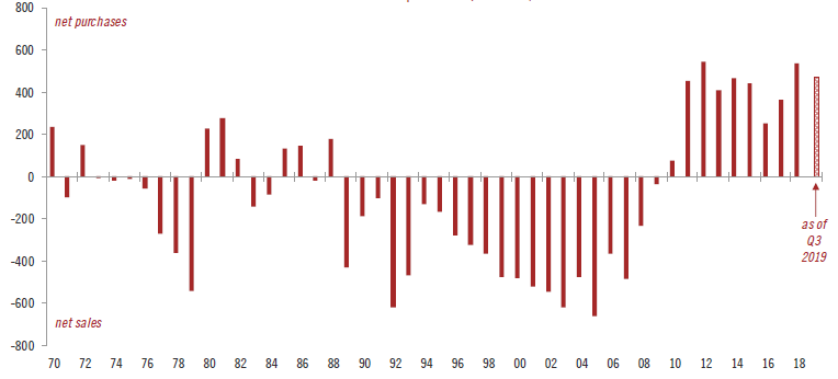 このような傾向は、先進国の中央銀行に比べて金準備の少ない新興国の中央銀行に特に顕著に見られます。金のリスク分散特性と、デフォルトリスクのない代替資産が他に存在しないこととが示唆するのは、中央銀行の金需要が今後も金価格を下支えるということです。中央銀行の金需要は2018年に過去最高水準を更新していますが、2019年には前年の記録を塗り替える可能性も予想されます(図表3)。