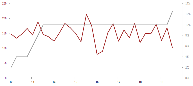 上記の要因が、2019年7-9月期の宝飾需要の落ち込みの一因です。宝飾需要は、夏場の金価格の急騰と、貿易摩擦を巡る米中間の緊張の高まりの影響を被り、その結果、グローバル経済に対する懸念が強まる結果となったからです。その他の要因としては、中国の可処分所得を減少させた豚肉価格の上昇や、インドの10%から12.5%への関税率の引上げが挙げられますが、金需要全体に及ぶ影響が長期間続くとは思われません。インドの関税は、2012年初の2%から2013年8月の10%へと、これまで何度か引上げられていますが、ここ数年、金需要が減少したことはありません(図表2)。