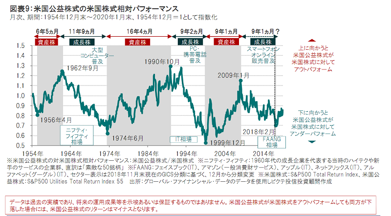 過去60年以上の米国市場の例をみると、新サービスや新商品の市場拡大を背景に米国株式全体のパフォーマンスが米国公益株式(資産株※注)を上回った時期(成長株の時代)と、逆に米国公益株式のパフォーマンスが米国株式を上回った時期(資産株の時代)が、約10年毎に繰り返してきたことがわかります(図表9参照)。
