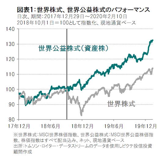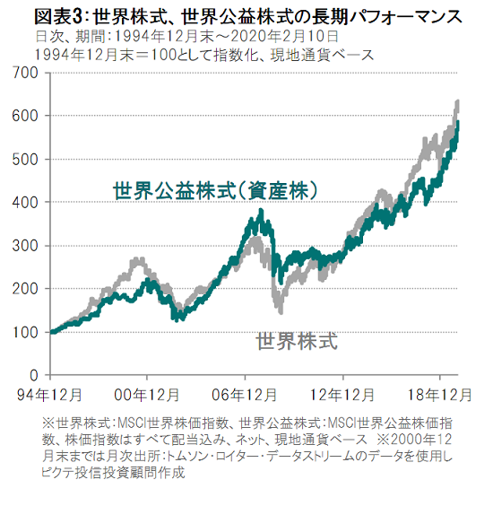 実際、世界公益株式、米国公益株式はともに2018年2月頃を直近のボトムとして、株式市場全体のパフォーマンスを上回って上昇しており、約9年ぶりに資産株の時代が到来した可能性があります。世界経済の先行き不透明感が高まっているため、公益株式に注目が集まる可能性があると考えます。