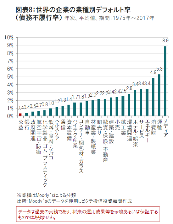 世界の公益企業は日常生活に不可欠なサービスを提供しており、業績が安定していることから、デフォルト(債務不履行)率も相対的に低く(図表8参照)、倒産しにくい業種であるといえます。こうした特性も、世界景気の先行きや金融市場の不透明感が高まるなかでより注目され、価格変動の安定に寄与している要因と見られます。