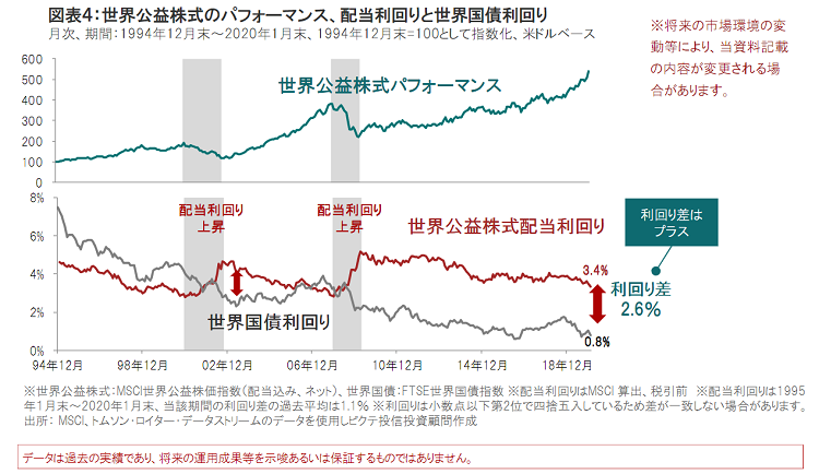 足元の高いリターンを支える要因の理由のひとつに、公益株式の配当利回りと世界国債利回りの利回り差の魅力が高まっていることがあげられます。