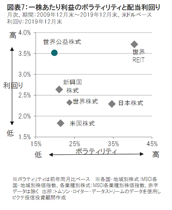公益株式は主要国・地域株式と比べて配当利回りが高く、かつ公益企業の収益の変動は小さいという特徴があります。