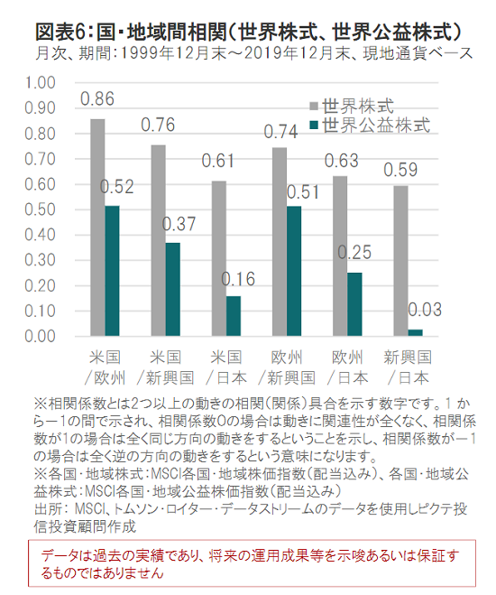 過去の実績では、世界公益株式の国・地域の相関は世界株式の国・地域相関と比べて低い水準です。(図表6参照)