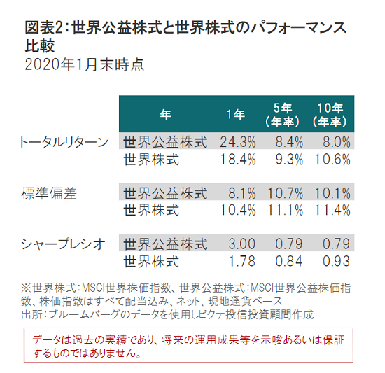 リスク(標準偏差)について、これまでの10年間(年率)と足元の1年間を比較してみると、世界株式が11.4%から10.4%へと低下するなか、世界公益株式は10.1%から8.1%へと大きく低下し、価格変動の安定性が高まりました。一方、世界公益株式のリターンはこれまでの10年間(年率)では8.0%と世界株式の10.6%を下回りましたが、直近の1年間でみると24.3%と世界株式の18.4%を上回り、パフォーマンスが向上していることが分かります。この結果シャープレシオは0.79から3.00へと変化し、リスクに対する投資効果が大きく改善しています。(図表2参照)
