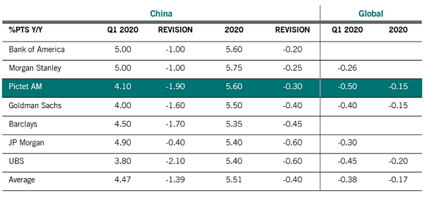 以上から、ピクテでは、2020年1-3月期の中国のGDP成長率予想(前年同期比)を1.9%下方修正しました。ただし、4~6月期には大幅な回復を見込んでいるため、2020年通年予想は、従来予想の5.9%(前年比)を5.6%(同)とし、0.3%の下方修正に留めました。