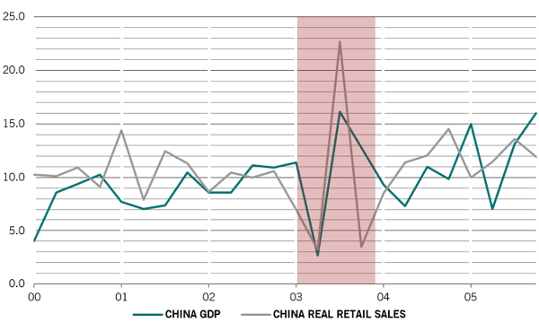 2003年の重症急性呼吸器症候群(SARS)発生時には、1~3月期から4~6月期にかけて、中国の実質GDP成長率(前年同期比)が1.5%のマイナス、小売売上高が2.3%の減少となったものの、その後は、それぞれ、1.2%および2.8%と大幅な回復に転じました。
