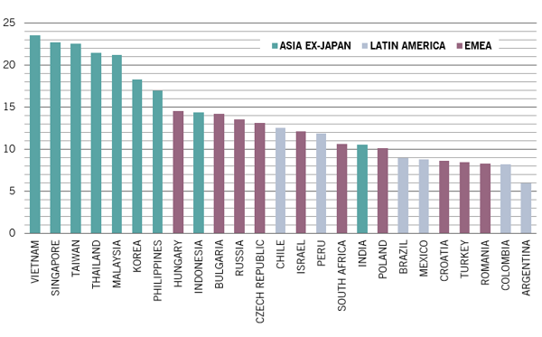 図表4:新型コロナウイルスの新興国全体への影響:中国の観光、交易およびグローバル・バリューチェーンに占める比率に基づいた国別ランキング