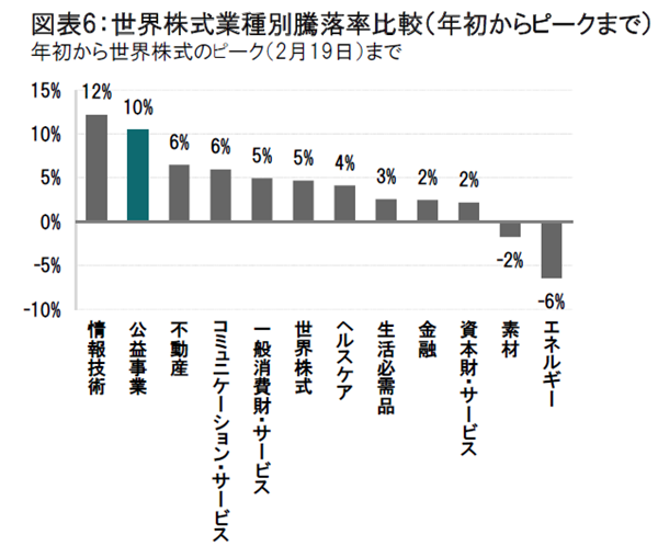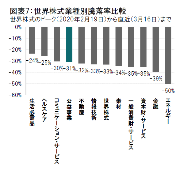 図表6は年初から世界株式のピーク(2月19日)までの業種別の騰落率です。エネルギーや素材セクターは原油価格や商品価格の下落でマイナスとなっていましたが、一方、情報技術や公益事業セクターは上昇しており、セクター別に異なる値動きとなっていました(図表6参照)。その後、世界株式のピークから直近(3月16日)までの業種別の動きをみると、公益事業をはじめとしたディフェンシブ性(景気の変動に左右されにくい特性)の高い業種の株式を含め軒並み下落しています(図表7参照) 。