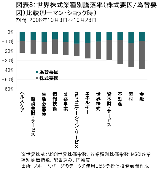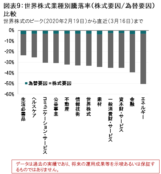 また、これまでの急落局面と異なる点は、為替の動きです。リーマン・ショック時の円換算での騰落率の内訳をみるとおよそ3割前後が為替がマイナス要因となっていましたが(図表8参照)、今回のコロナショック時では為替の影響が少なくなっている点です(図表9参照)。