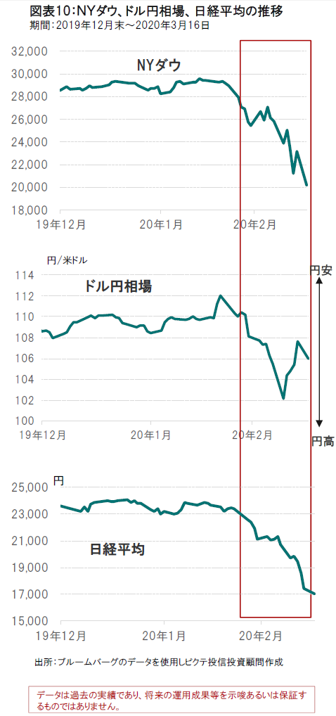 過去それほど経験したことがない価格形成パターンだからです。 株価の下落に対して円はそれほど円高になっていないようにみられます。2020年2月20日の112.02円から現在の105.96円(3月16日)は5.4%程度の円高に過ぎません(図表10参照)。同期間、日経平均は27.6%下落しています。一方、リーマンショック時の2008年10月3日から同年10月27日まで日経平均が34.5%急落する過程では、我々は11.5%の円高を経験しました。しかも、その当時は円高と日経平均の下落がほぼ完璧と言っていいほど連動していました。