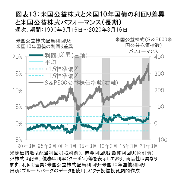 3月16日につけた米国公益株式と米国10年国債の利回り差異は3.2%と2002年10月の3.1%の最高値を更新し、過去平均からおよそ1.5標準偏差の水準を超えています。
