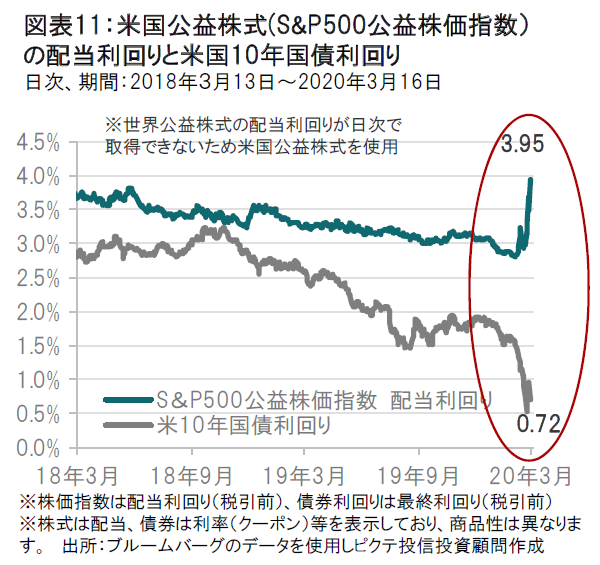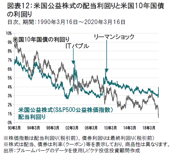 コロナショックによる世界的な株式市場の下落は、リーマンショック、ブラックマンデー並みの大きさです。米国国債をはじめ世界国債利回りは過去最低値水準となっています。一方、世界公益株式の配当利回りは株価下落で上昇し相対的な魅力が高まっています。