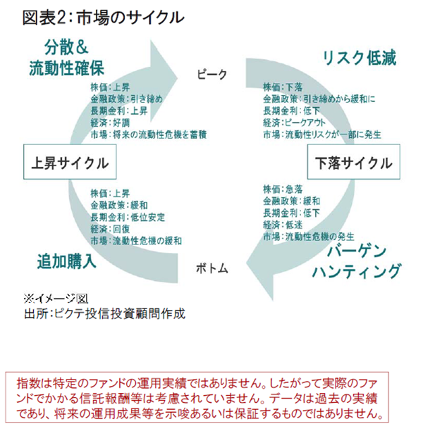 世界景気は景気後退サイクルに突入し、市場は下落局面をむかえています。市場の不透明感は高まっており、今後も下落し続ける可能性があり、注視が必要ですが、歴史的にみるとこうした局面が長期的な投資機会を提供しているといえます。