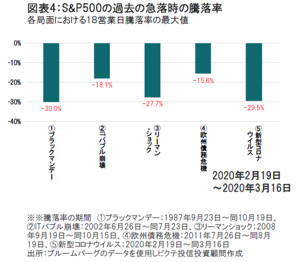 非常に短期間で株価は急落しました。この背景には、コロナショックが、需要ショック(人の移動の抑制、イベントの中止などによる需要減退)、供給ショック(工場の閉鎖、物流の混乱による企業へのマイナスの影響)へと広がったことがあげられます。2020年2月21日から始まった株価の下落はリーマンショックなど過去の市場崩壊と同程度のスピードでかつ大幅なものとなってきています。