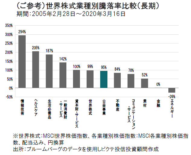世界の投資家は金融市場をドルベースでみますが、世界の公益株式はドルベースで2月18日にピークをむかえています。超長期でみると、この下げは、リーマン・ショック以来の値下がり率となっています。