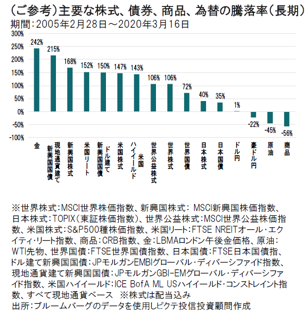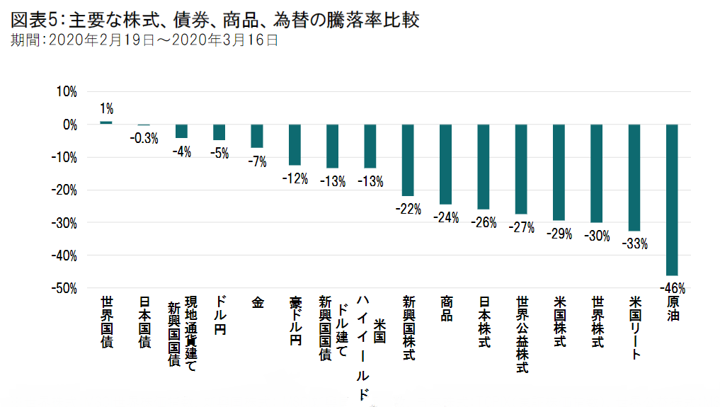 図表5はそれぞれの資産がそれぞれの市場(現地通貨)でどれだけ下がったかをみたものです。3月9日以降円安となり、国債利回りが上昇しました。加えてサウジアラビアの増産発表で需給調整ができなくなり原油が下落した影響も加わりました。