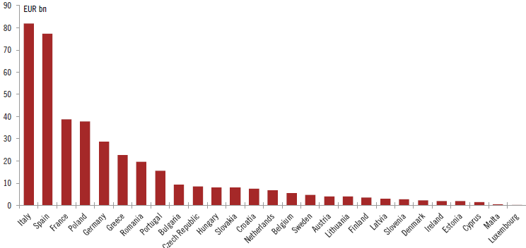 基金の国別配分については、欧州委員会がさまざまな基準に基づいてシミュレーションを行っています。これによると、イタリアへの配分額は811億ユーロ(約9.7兆円)、スペインは773億ユーロ(約9.2兆円)、そしてフランスは390億ユーロ(約4.7兆円)となります。この金額は今後の議論のベンチマークとなるものですが、公式の数値ではないことに留意が必要です。(図表参照)