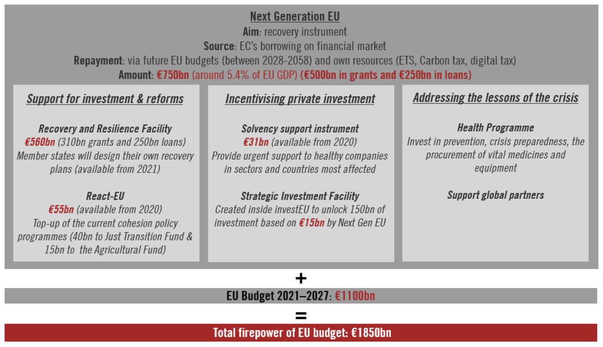 「次世代のEU」基金は、5,000億ユーロの返済不要の補助金と2,500億ユーロの融資から構成されており、3つの役割を持っています。第一にコロナウイルスによって被った損害に対する投資と修復のための資金であり、第二に民間部門の投資を促進するものであり、第三に将来の同じような危機を防ぐためのものです。